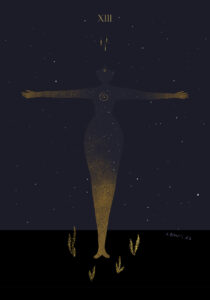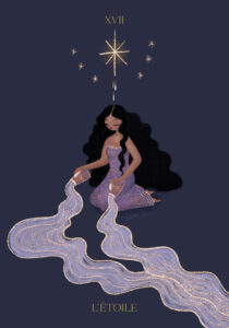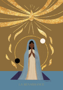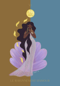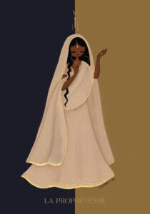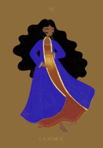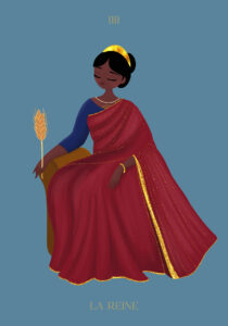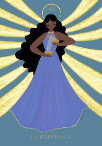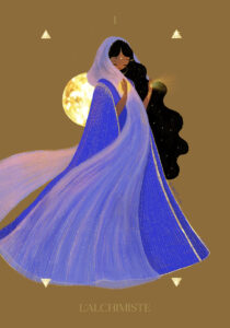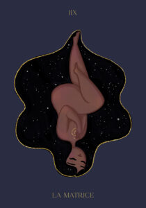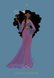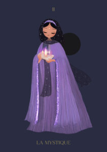 Contrairement au Tarot de Marseille, mon travail présente exclusivement des figures féminines, alors que ce dernier est paritaire sur ce plan. Il n’est bien sûr pas question ici d’effacer la dimension masculine, mais d’opérer un choix énergétique. À travers ces créations, nous plongeons dans la dimension concave, «féminine», yin de la spiritualité et du divin. Nous nous reconnectons à un mysticisme qui fait appel à l’énergie féminine présente en chacun de nous, nous invitant à expérimenter la réalité divine non pas par le biais du mental, mais dans le sentir, en tant que réceptacles.